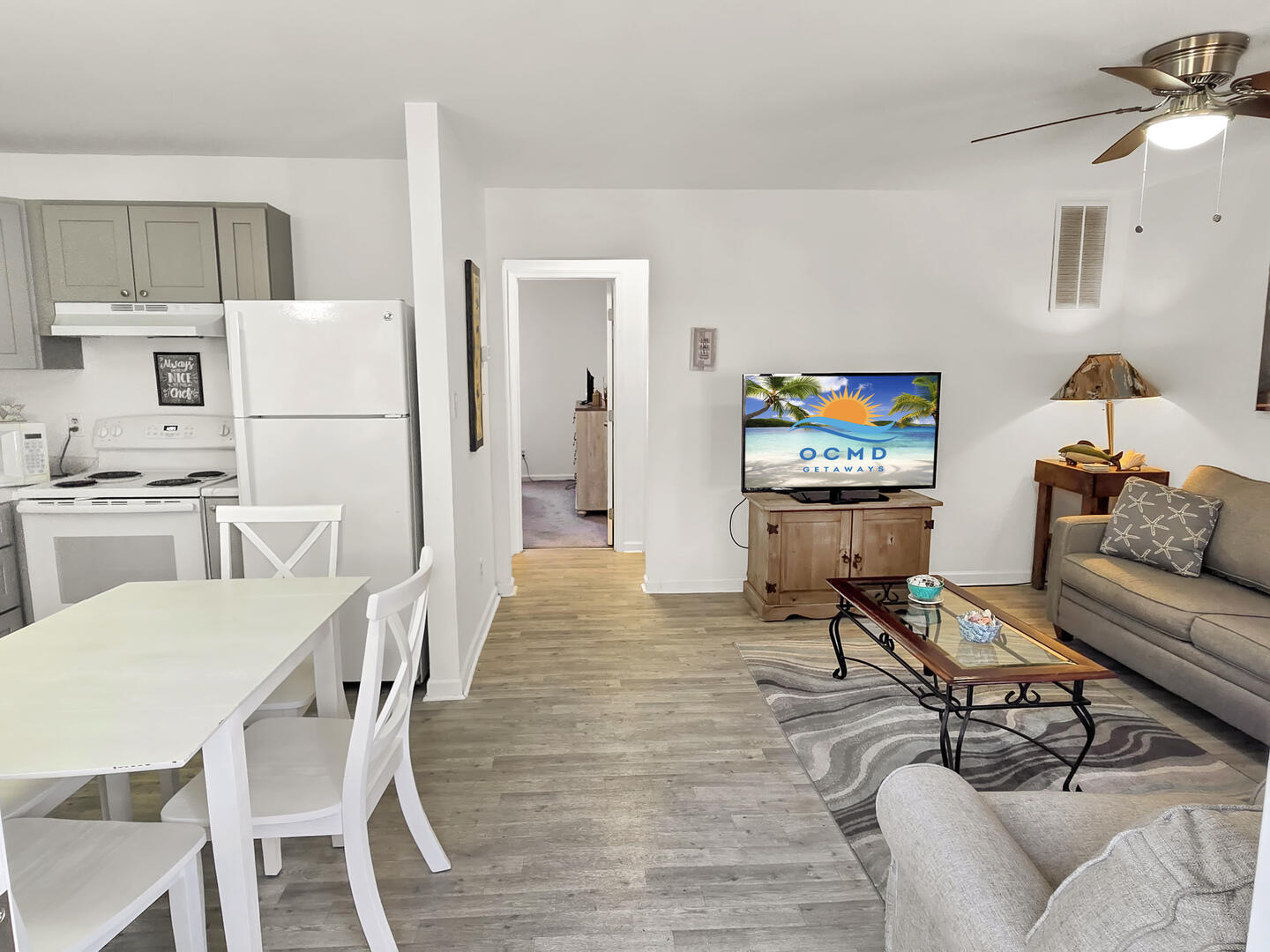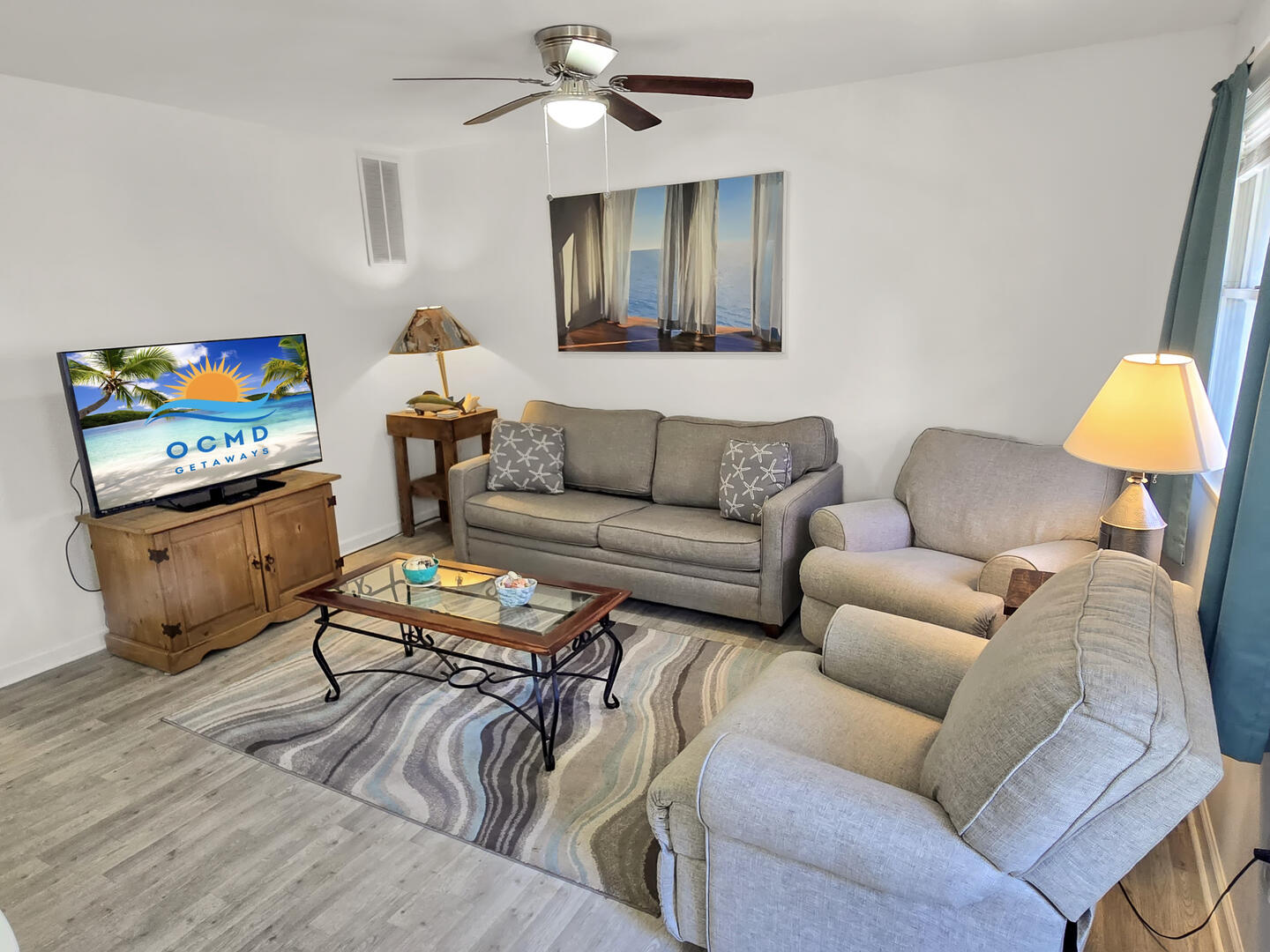 Pet Friendly North Ocean City 2 bedroom condo,1 bathroom condo - just 3 blocks to the beach and Atlantic Ocean! Enjoy the peaceful North Ocean City location (143rd St.) but still be close to everything - the beach, shopping, restaurants and more. You'll enjoy high speed internet/wifi and central air conditioning in this great condo. You can also bring 2 of your furry friends to the beach! Both bedrooms have a queen sized bed and there is also a queen sized sleep sofa so you can sleep 6 people comfortably. All TVS are smart TVS so you can enjoy your favorite streaming services (logging in with your own credentials). This condo is located on the first floor and includes a washer and dryer along with one assigned parking spot. However, this is typically plenty of free street parking available nearby.