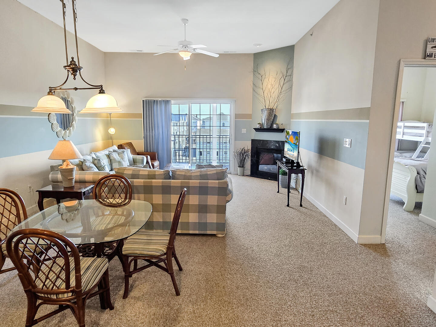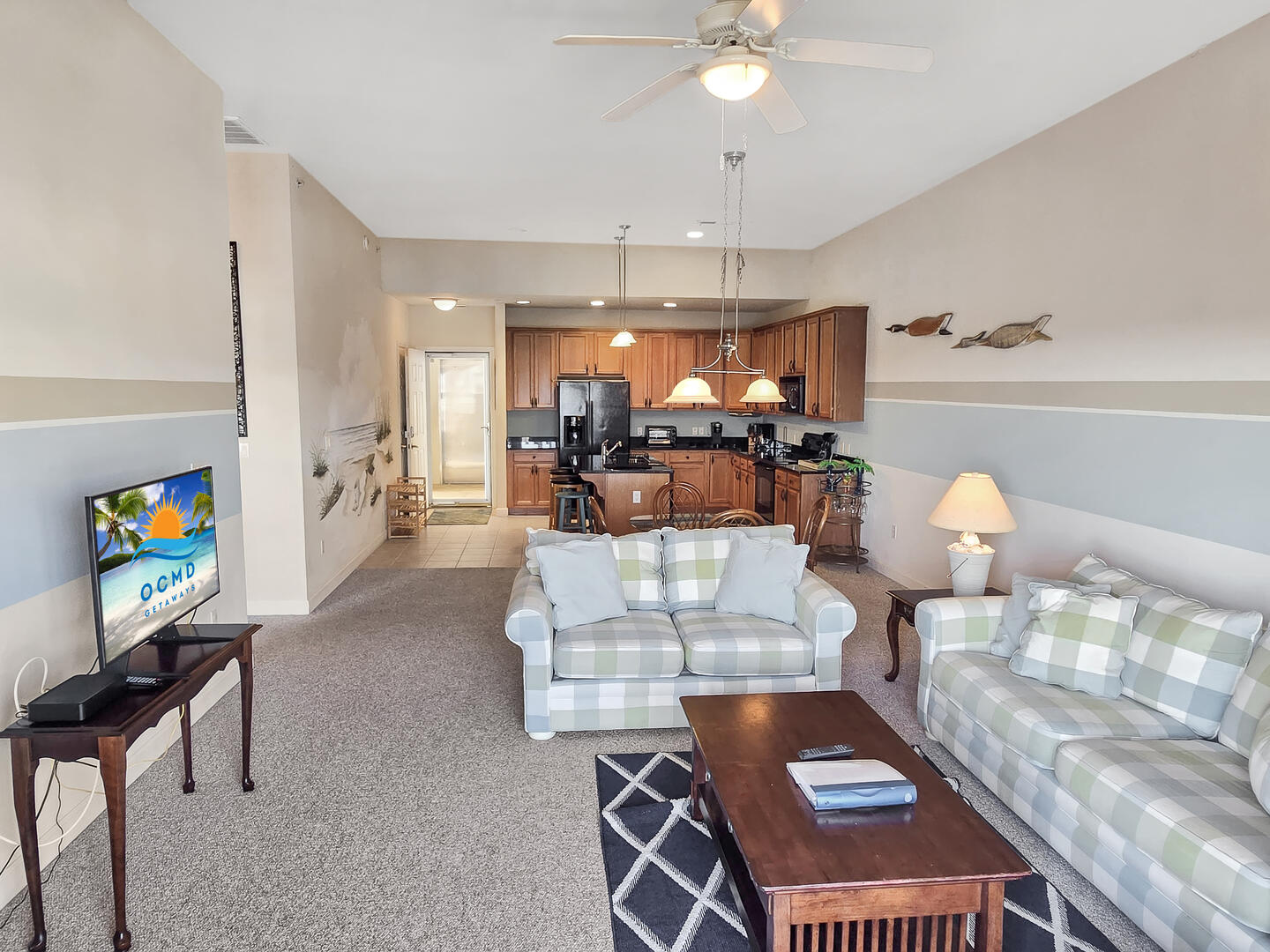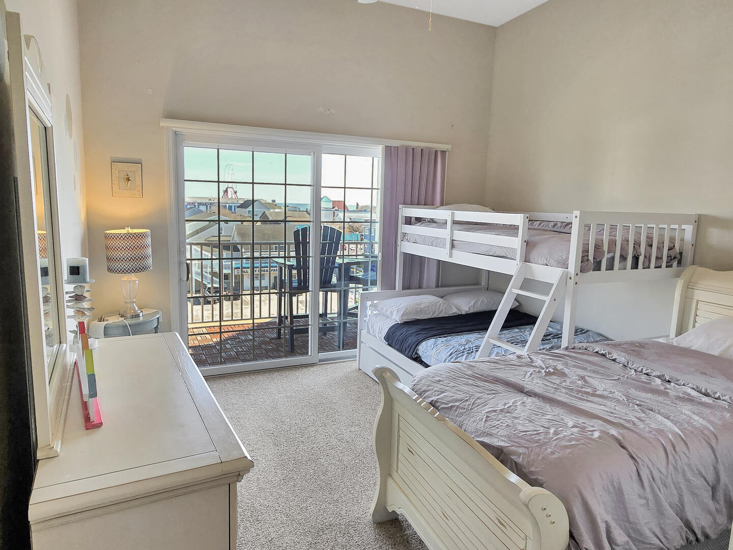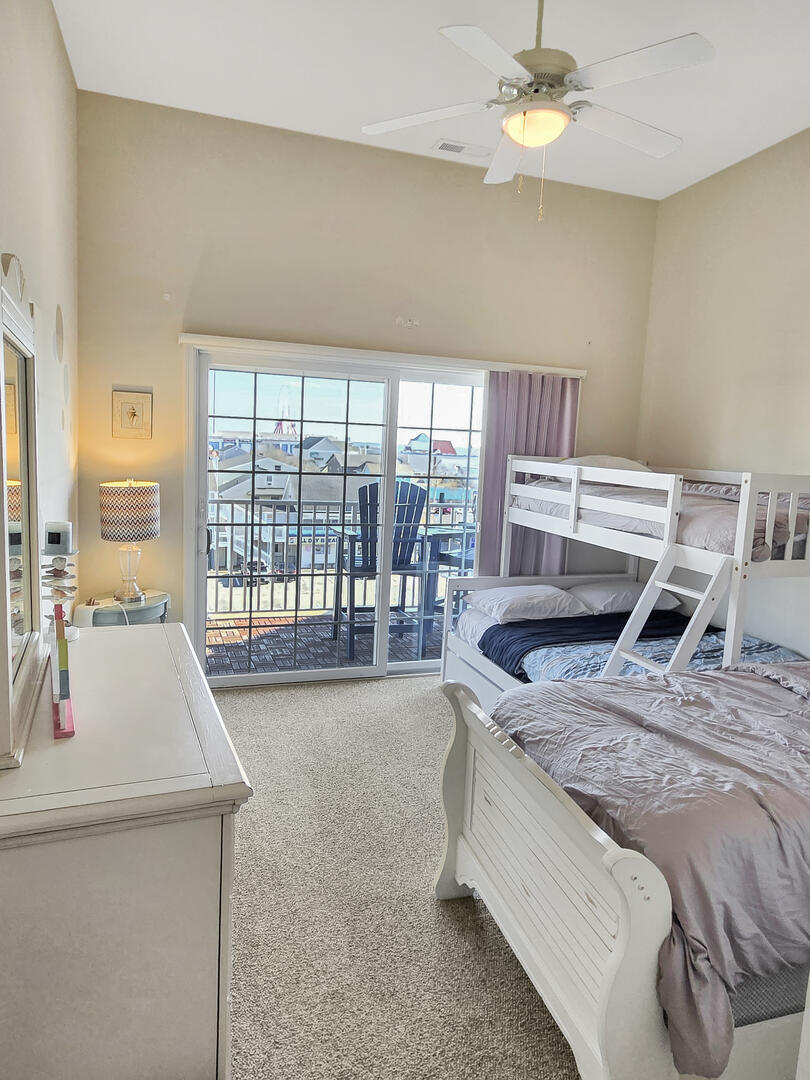 DOWNTOWN Ocean City 2-bedroom condo in one of the best locations you will find - just a couple of blocks away from the famous boardwalk, beach and Atlantic Ocean! You'll love being walking distance to historical restaurants, rides, and arcades. You're just 1 block to the bay and 2 blocks to the ocean - close to everything downtown. Right off the bat the living room is a dining area, perfect for cozy meals with the family. Next to the dining area is the kitchen with an island, just right for grabbing a quick bite. The main bedroom has a queen-sized bed, and the second bedroom has a pyramid bunk (single mattress on top with double mattress on the bottom) and a twin bed. The living room also includes a queen sleep sofa so you can sleep 8 people comfortably.